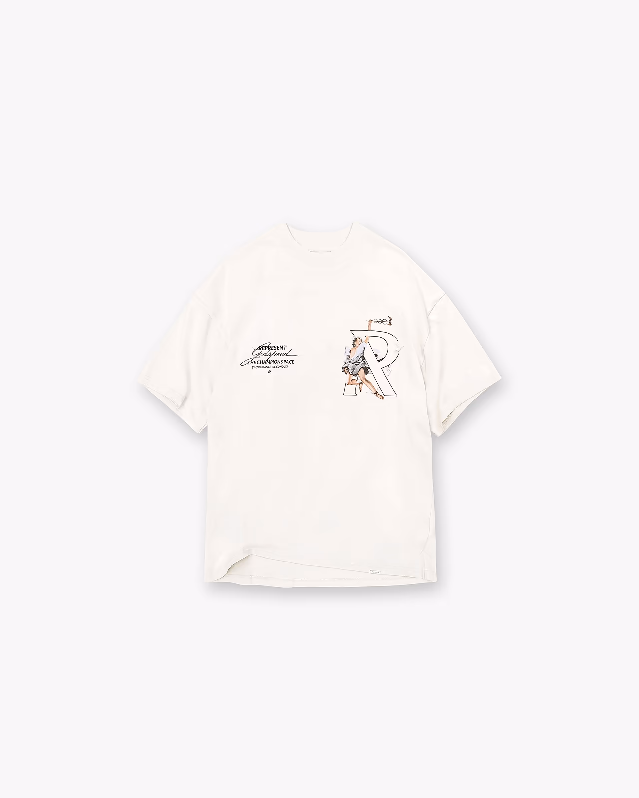 Introducing the Hermes T-Shirt in Flat White, a luxury oversized t-shirt crafted from medium weight jersey cotton. The t-shirt features a high density screen print graphic to the front and back with a Represent metal bar logo to the hem.