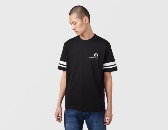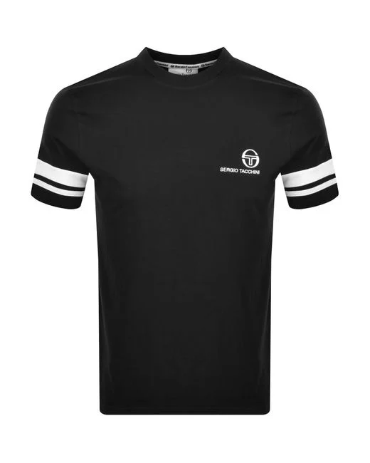 Sergio Tacchini Frankie T Shirt In Black And White. A classic jersey t shirt with a ribbed crew neckline and short sleeves. The signature Sergio Tacchini logo is embroidered on the left of the chest. Two panels situated on the sleeves. 100% Cotton.