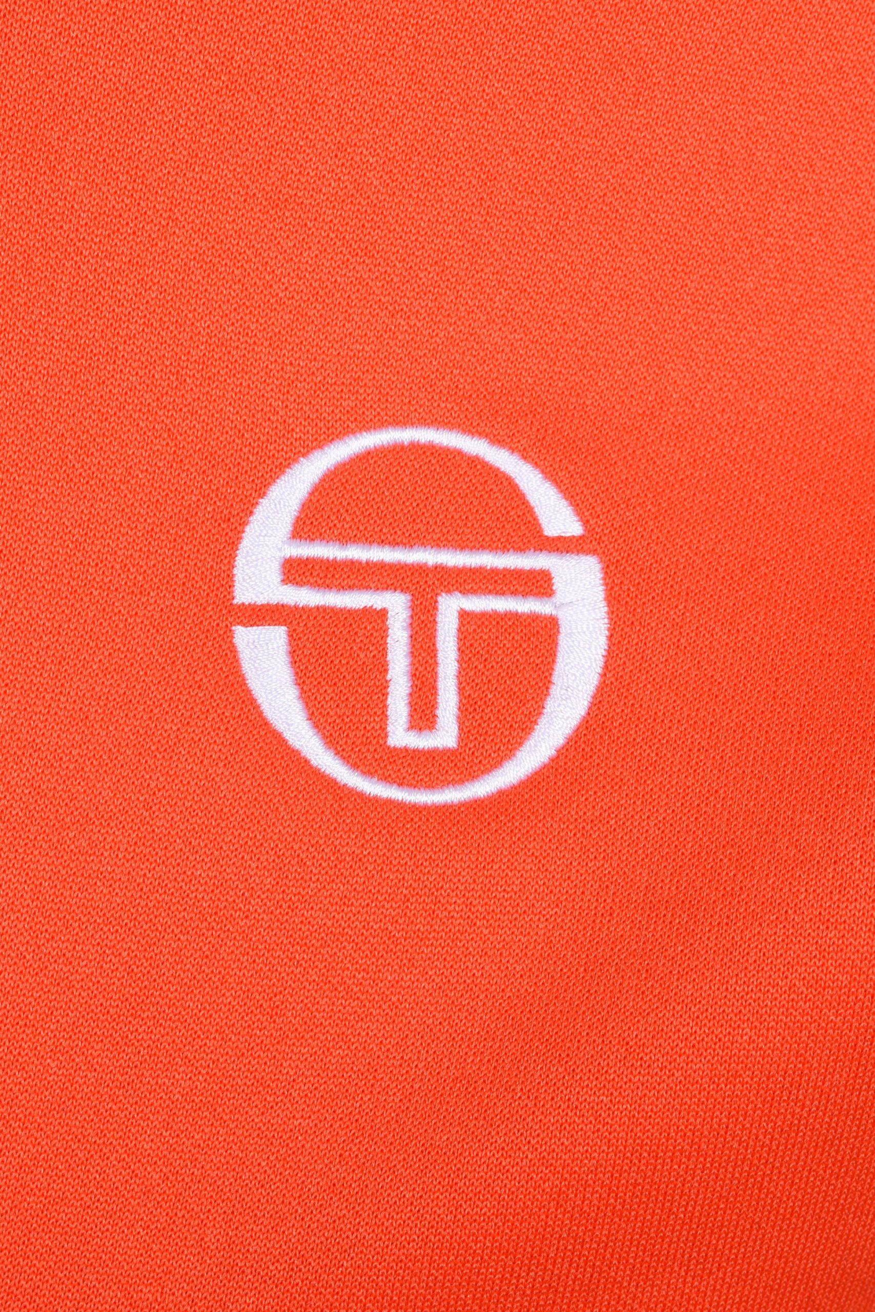 Sergio Tacchini Orion track top in Tangerine Tango/Black. Soft polyester/cotton blend fabric. Full front zip fastening with a signature Sergio Tacchini branded zipper. Funnel neck collar with piping detail. Piping across the chest and back with twin panel detail across the sleeves. Embroidered Sergio Tacchini logo on the chest. Two front pockets. Ribbed sleeve cuffs and hem. Slim fit. 60% polyester, 40% cotton.